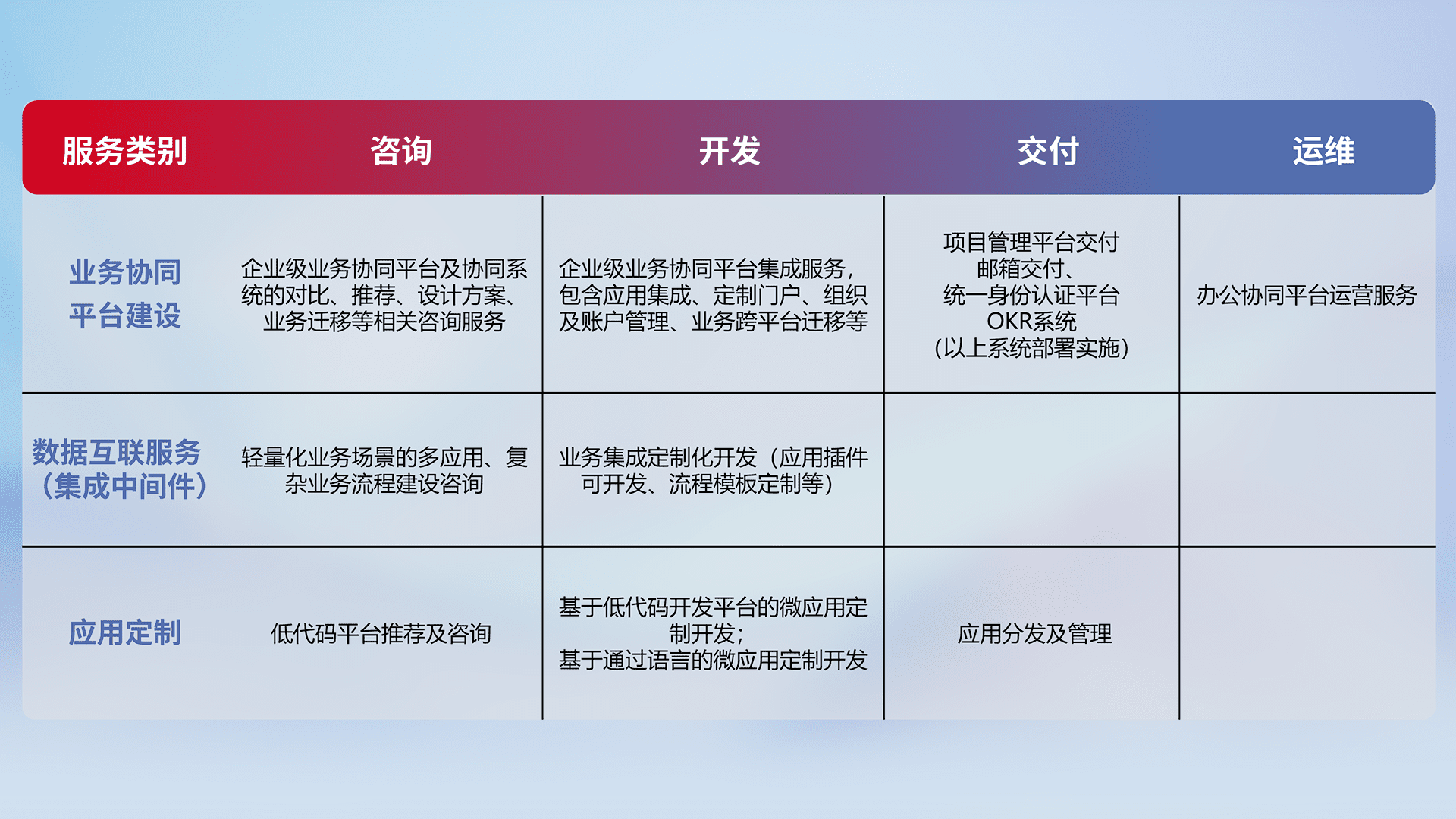 针对钉钉、、、企微、、、IDaas等平台级产品提供产品的规划、、、方案、、、、交付、、、定制化开发等服务,,,实现如统一协同办公、、、、智能客户服务、、、混合会议管理、、智能数据查询、、、等业务场景,,,,实现数字化转型。。。。